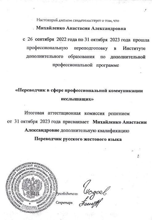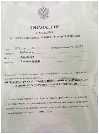 - возможность предоставления инвалидам по слуху (по слуху и зрению) услуг сурдопереводчика ( тифлосурдопереводчика) - имеется (Подколзина А.А. имеет диплом переводчика русского жестового языка);